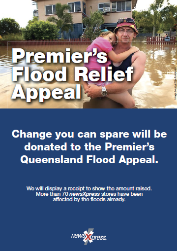 All newsXpress stores across Australia have been provided with collateral for supporting the collection of cash donations from customers for depositing into the Premier’s Flood Appeal account. Click on the image to see a larger version of the poster which has been created. In support of transparency, newsXpress outlets will display receipts, showing the total amount of money raised in-store for the appeal. The same approach was used successfully to raise considerable funds for the Victorian Bushfire Appeal.