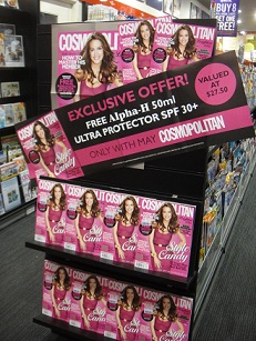 We have been promoting Cosmopolitan magazine on an aisle end facing a reading nook we have for woman’s magazines. While toward the back of the store, we certainly see shoppers browse and purchase off displays we place here. We find that people who get to the end of our magazine aisles and into this reading space tend to be the more avid magazine customer – hence the value of good displays to help drive impulse purchases. I guess my point is that displays don’t always have to be in a high traffic location to work. In our case, down here in this location, the lack of visual competition works to the favour of the title on promotion.