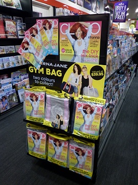 We are promoting the latest issue of Cleo magazine with this aisle end display. We have opened out the pack to show the free gym bag (click on the image for a larger version), to make the offer more easily understood by shoppers.