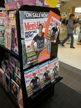 We are promoting the latest issue of Men’s Health magazines with this display at the front of the store. The display can be seen from out in the mall as well as from inside the shop. We are primarily using this display to attract shoppers from the mall.
