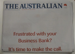 Frustrated with your bank? That’s the heading on The Australian newspaper here at Sydney airport this morning. Actually, it is not the headline. It is an ad. A four page wrap around ad which one has to remove and discard to get to the newspaper. So much for the front page of the newspaper selling the news. Those were the days … when news mattered.