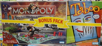 One of the products I really like is the bonus board game packs. We have several. Check out the Monopoly bonus pack in the photo. By offering Taboo shrink-wrapped with Monopoly for less than the RRP for Monopoly shoppers see that we are delivering value and pushing back on the consumer sentiment that newsagencies are more expensive than other businesses.