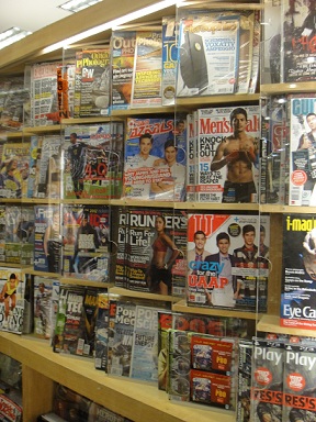 This is a magazine display unit at the front of a large book and stationery business I visited yesterday in Pasig City Manila. It was compact yet showing off the full cover of each title – one title per pocket in most pockets. Very browser friendly and space efficient – but a visual barrier due to height. I’d say they had around 300 magazine titles on display so not a big range by our standards. This size of display was rare in Manila from the two major shopping malls I visited.