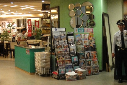 I noticed several retail businesses in manila selling magazines including this large homewares store. Yes, those three stands on the right of the entrance all contain magazines. Each from a different distributor or publisher from what I can see. I am guessing that they pay for this placement.