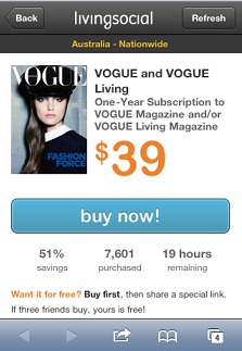 It seems that News Magazines likes livingsocial for selling its magazines – hot on the heals of their promotion of MasterChef magazine is $39 a year deals for Vogue and Vogue Living.