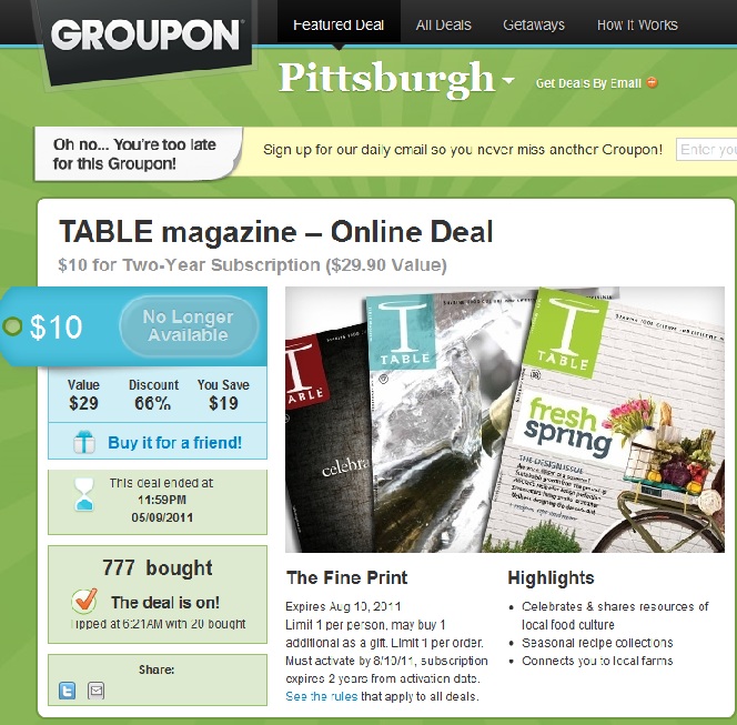 Take the deal in Pittsburgh for Table magazine. $10 for a one year subscription. Click on the image to see the details. This 66% discount is extraordinary. It would anger me as a retailer who is asked by the publisher to raise the awareness of their product. Often it is the work of retailers in promoting a masthead that enables the masthead to undercut retail prices to chase a direct to consumer sales relationship.