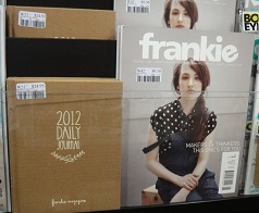We are promoting the frankie diary for 2012 next to the current issue of the magazine. We ordered stock of the diary last week and are thrilled to have this available for our customers – given the continued growth in sales of the magazine. While the frankie diary is not an ideal fit in the magazine fixturing, it is the perfect placement if we are to reach the shopper most likely to purchase. We will maintain this placement as long as we have and can get stock. Newsagents wanting to order the frankie diary ought to contact Gordon and Gotch. Have your frankie magazine sales numbers handy to use as a guide in ordering.