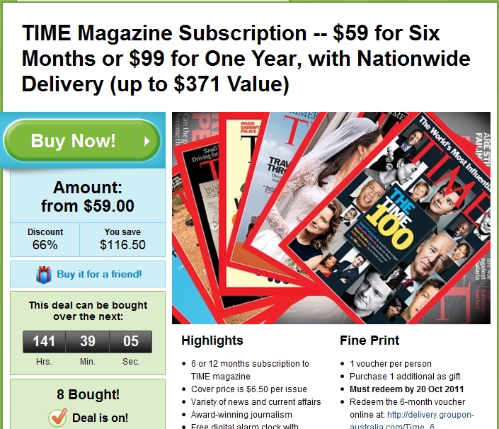 It is disappointing to see Time magazine being offered for 73% off for a one year subscription with a Groupon deal. While only 8 have signed up so far, the deal has quite some time to run.