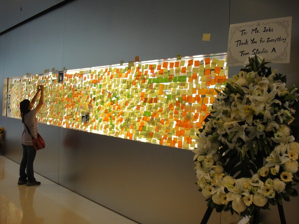 I was at the newly opened (just this past week) Apple store in Hong Kong at the weekend and was surprised to see the make-shift shrine created by Apple fans in honour of Steve Jobs. Click on the photo to see what I saw in detail. What the photo does not show is the constant stream of 40 or 50 people standing in silence, some taking photos.
