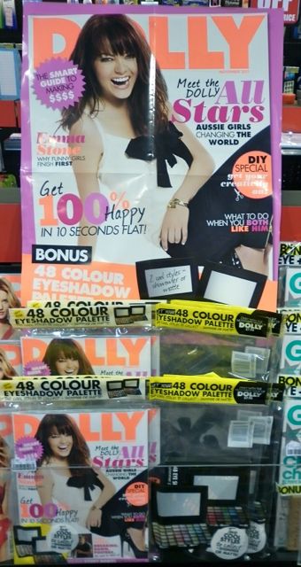 We are promoting the latest issue of Dolly magazine with this in-location display. Emma Stone is in a movie which recently came out recently, The Help, so her placement on the cover is perfectly timed. It’s a cover which could / should drive incremental business for us – hence the high profile placement.