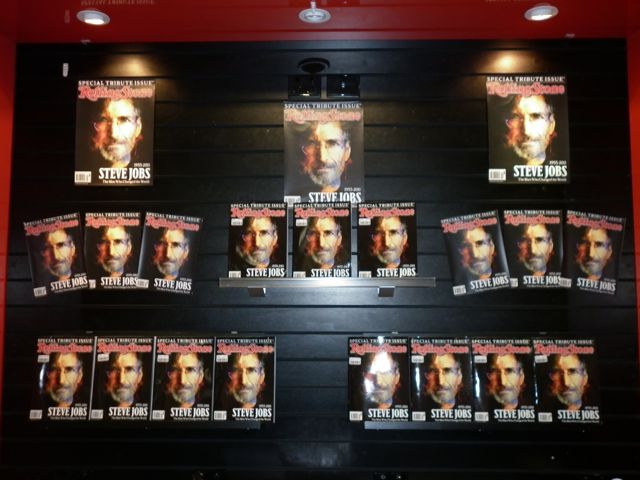 We promoted the Steve Jobs cover story in the re-issue of Rolling Stone magazine with this behind the counter display at one of my newsagencies. The display looked stunning … there is no missing this as you enter the newsagency. Our goal was for the Rolling Stone story to be noticed by everyone who may possibly be interested in the story of the life and passing of Jobs. This counter display achieves that. It’s driving impulse business as well as good customer interaction.
