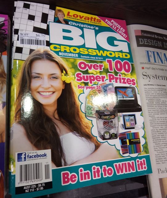 I travel a bit and see plenty of guys passing time doing crosswords, sudoku and other puzzles in newspapers. However, back at the newsagency we tend to focus the promotion of crossword and puzzle titles on women. I am trying something different at the moment. Yesterday, I placed copies of the latest issue of Lovatt’s BIG Crossword next to the Australian Financial Review. We still have stock at the usual location so we won’t lose sales to regulars.