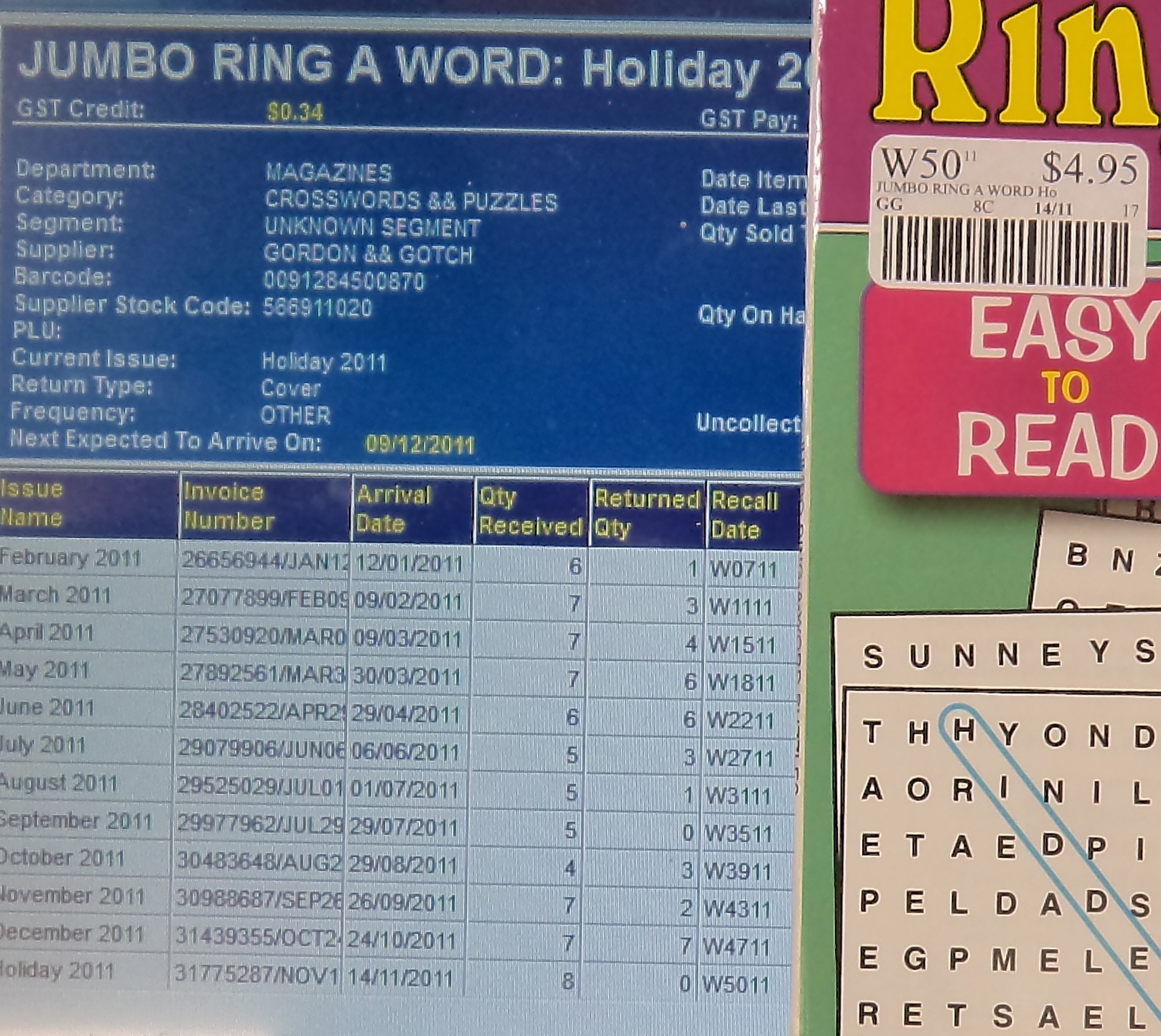 Click on the image to see a screen shot from my newsagency software showing supply and return data for Jumbo Ring A Word, a imported crossword title distributed by Gordon and Gotch.