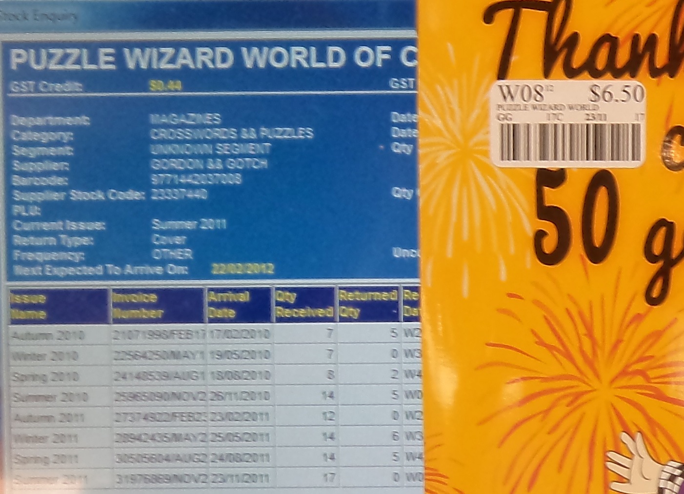 Further to my post yesterday documenting a case of magazine oversupply, here is another example – for The Puzzle Wizard World of Crosswords. As the data in the photo from my newsagency software shows, sales have been volatile. However, not sufficiently volatile to justify an increase from fourteen copies to seventeen as has just happened.
