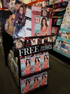 We are promoting TV Week this week with this display on our highest profile magazine aisle end. The free Twilight calendar is out at the right time – timed with the release of the new movie. This helps us attract a younger shopper – given the target audience for all things Twilight.