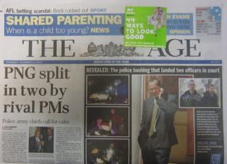 While the police were raiding the offices of The Age newspaper in Melbourne yesterday, the paper was on sale with masthead part covered by a stuck on ad, like what delayed the Adelaide Advertiser on Monday.