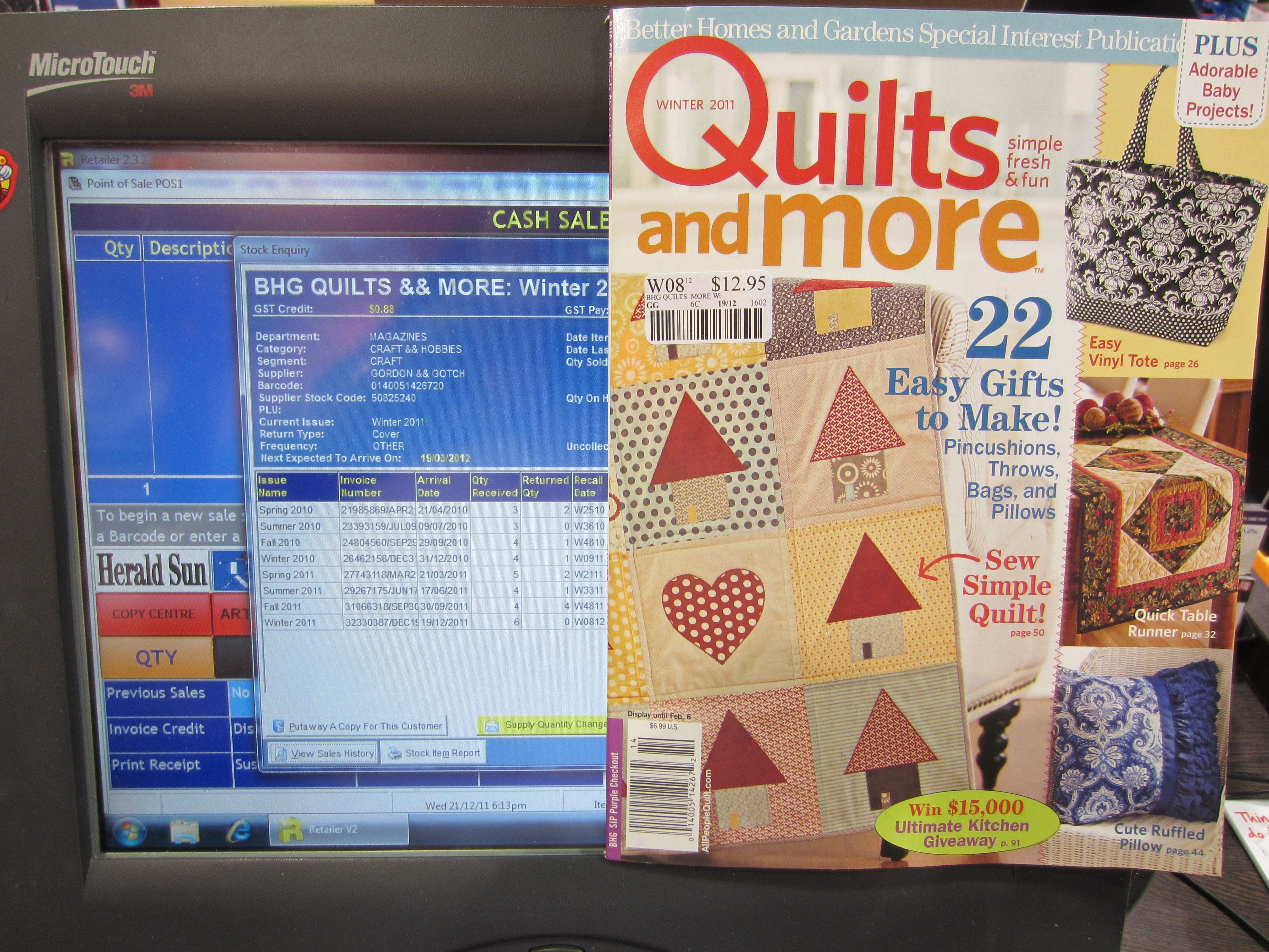 Gordon and Gotch has once again showed their skill at magazine distribution by increasing our supply of Quilts & More magazine by 50%, two copies, with the latest issue. Any reasonable assessment of our sales history (click on the image to see this) indicates that an increase in supply is not warranted. All I can think is that Gotch wanted to place the stock somewhere and not in their warehouse.