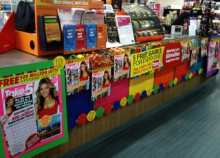 The creative team at one of my newsagencies gas setup this terrific display at the counter to promote the latest issue of Take 5 magazine and their lottery offer of five free games. Placement at the counter where we sell lottery tickets makes sense. We also have Take 5 located in its usual position so as to not lose traditional shoppers.