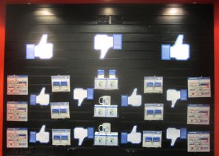 We have created a new display behind the counter to promote a range of Facebook related products: Like and Dislike rubber stamps, coffee and tea mugs and fridge magnets. Combined, the products tell a story.