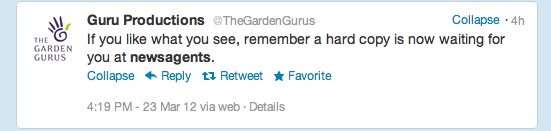 It was good to see the publisher of The Garden Guru magazine, out last week, using Twitter to promote traffic to newsagents. While they only have 365 followers, that’s 365 people told to buy the magazine from their local newsagency business. Publishers please take note, tap into your social media community to promote our channel – we promote your title and offer free browsing so how about returning the favour.
