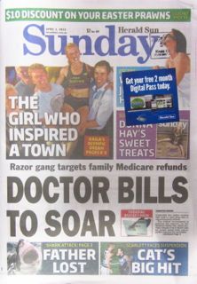 The photo shows yesterday’s Sunday Herald Sun. [insert groan here] They had a house ad promoting their digital subscription stick over the headline for a story. I bet some newsagents removed the ad.