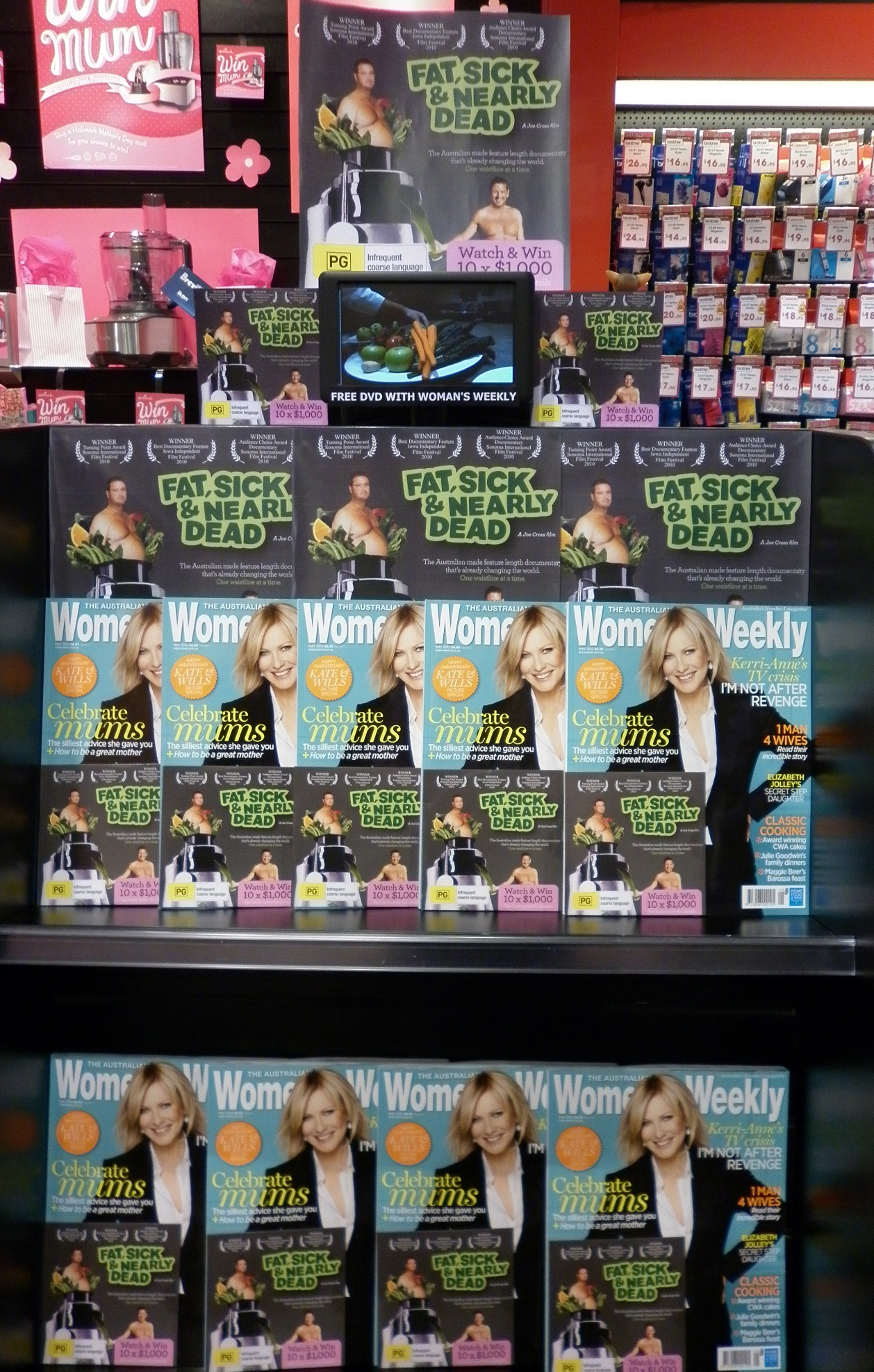 The team at my newsXpress Knox store are tech savvy smart and retail smart. To make the most of the free DVD, Fat, sick and nearly dead which comes with the latest issue of The Australian Women’s Weekly, they are playing it on our customer displays. These are located just above a counter display we have promoting the title. Click on the image to see what they have done in detail. Simple. Tactical. Successful.