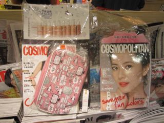 Check out the gifts with the latest issue of Cosmopolitan magazine here in Hong Kong. For the usual cover price you get a bonus, current-issue, magazine, lip gloss and a make up bag. Three bonus items, for the usual price.