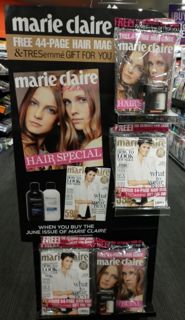 We are promoting the latest issue of Marie Claire magazine with this placement at the entrance to our main women’s magazines aisle.