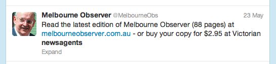 Thanks Melbourne Observer ·May 25, 2012 ·Mark Fletcher ·0 Comments The Melbourne Observer continues to support newsagents. Most recently with weekly tweets on twitter promoting the latest issue as being available from newsagents. Other publishers could so easily do the same. Happy to promote the support here. 0 likes newsagency marketing Leave a Reply Cancel replyYour email address will not be published. Required fields are marked *Name * Email * Website Enter Code * Captcha Comment * Δ Post navigation Next ArticlePrevious Article