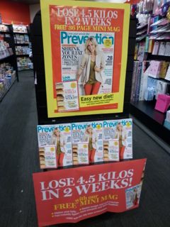 We are promoting the latest issue of Prevention magazine with this display at the entrance to our women’s magazine aisle. The Lose the wheat lose the weight mini mag promoting a weight loss of 4.5 kgs in 2 weeks should attract plenty of interest. The message for shoppers is very simple.