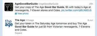 While it was terrific to see The Age using Twitter to promote their Good Bar Guide, a disconnect in their distribution system saw not all newsagents with the title. Shoppers see newsagents as newsagents. They don’t know if they are retail only and relying on a commercial distribution newsagent to support their publisher supplier by placing a product in the newsagent outlets they supply.