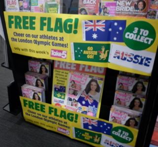 We are promoting the latest issue of Take 5 and the offer of a free flag with which to cheer on the Australian Olympic team with this in-store display.