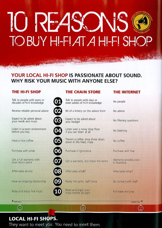 The full page headed with 10 reasons to buy hi fi at a hi fi shop is a passionate pitch for shopping at a hi fi shop over a chain store and over online shopping. It’s social responsibility in action.