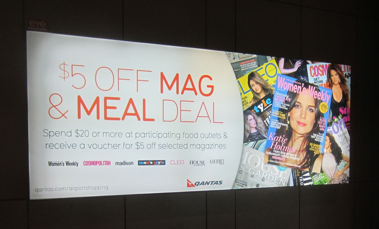Travellers through the Qantas terminal of Sydney airport can get $5 off selected magazines if they purchase their food at a participating food vendor. There is already the ACP buy 3 for $10 deal.