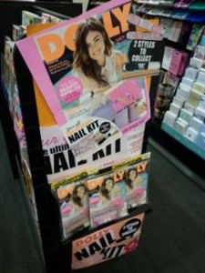 We have been promoting the latest issue of Dolly magazine (and the free nail kit) with this aisle end display plus a waterfall placement in the usual location for the title. Both allocations will run for the first week of the on-sale.