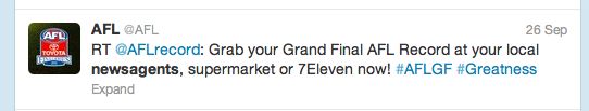 AFL supports newsagents ·September 29, 2012 ·Mark Fletcher ·0 Comments More than 91,000 AFL fans on Twitter received a tweet from the leag promoting newsagents in blod and ahead of other retailers for sourcing the 2012 Grand Final AFL Record. I appreciate the support by the AFL of newsagents to their Twitter followers. 9 likes newsagency marketing Leave a Reply Cancel replyYour email address will not be published. Required fields are marked *Name * Email * Website Enter Code * Captcha Comment * Δ Post navigation Next ArticlePrevious Article