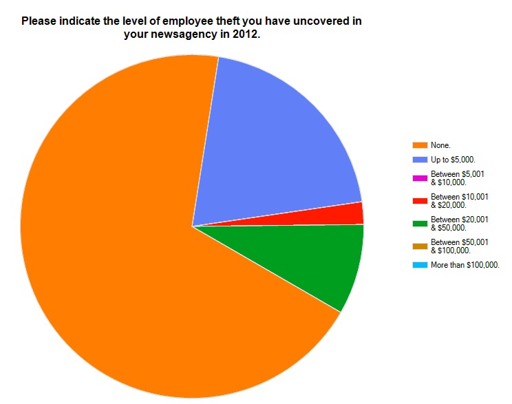 On theft by employees, 69.1% said they had suffered none in the last year, 20.2% said it has cost up to $5,000 and 8.5% said it had cost between $20,000 and $50,000 in the last year.