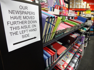 Two weeks ago we relocated newspapers a further three metres into the store. They are now at the end of our diary wall. There has been no negative impact on sales as a result of the move, no complaints from customers.