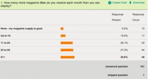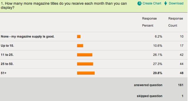 I was surprised that 86.3% of respondents thought they could increase mag sales with more control of supply. I’ve never had a problem getting supply of a title if I want it, so I’m happy I can have the titles I want and can sell. It’s the ones I don’t want but can’t get rid of that cause the problem.