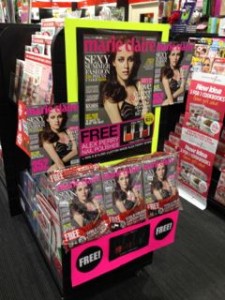 We are promoting the latest marie claire with this aisle end display. The free Alex Perry nail polishes packaged with the magazine make it challenging for the pocket-type fixtures so allocating this space became essential to the merchandising of the product.