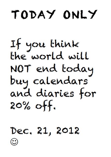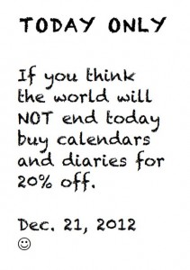 Disagreeing with myself (and conflicted about this), we are running a one day only end of the world sale opportunity on calendars and diaries. I went with this as it made me laugh. Anyone who does think the world will end today does not get the discount.
