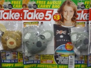 I like the Australia Day themed cover and giveaway with the current issue of Take 5 magazine. This is a nice connection with the day. We gave it a push with additional pockets for display, ensuring that the free bag was on show for shoppers to see.