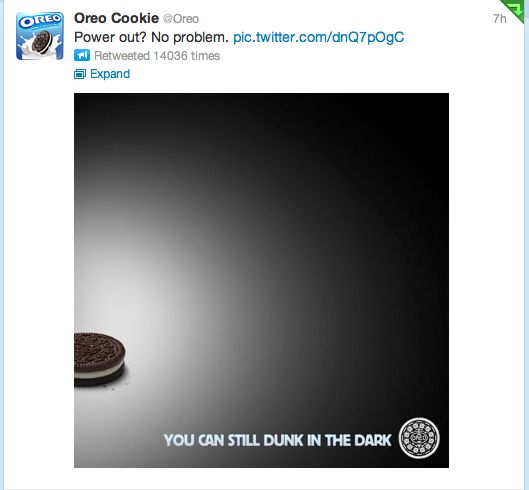 This tweet promoting Oreo cookies during the blackout that hit the Super Bowl in the US was brilliant. It was perfect use of Twitter and a good example of a brand setup to be engaged quickly when the right opportunity presents.