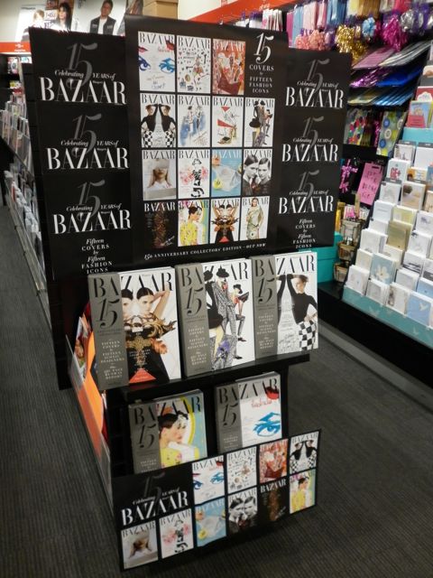 This aisle end display promoting the special 15th birthday edition of Harper’s Bazaar features the terrific collateral provided by Bauer for the occasion, collateral that works especially well on our fixtures. I like that we have different material to work with here. PS. This is the issue I mentioned yesterday.