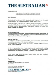 I’ve got 1 solitary direct subscriber for the Oz so I’ll be interested to see if Rupert is going to courier it to country WA. Either way its a public holiday Monday 4th in the West so they won’t be seeing it till Tuesday. At least the BMW ad’s will still be fresh unlike the news.