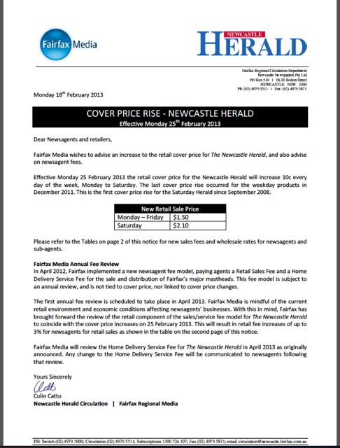 The people at The Newcastle Herald wrote to newsagents at the start of this week announcing a price change from next Monday. They didn’t tell the software companies though. The people who help newsagents with what is significant change were kept in the dark – left to find out by accident.