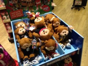 I played with our AFL Beanie Kids display to reflect the drugs cloud currently hanging over the Essendon Football Club. It was a bit of nonsense fun but couldn’t get it right so I put the display back. I was looking for represent the Essendon mascots as drug enhanced compared to their competitors – like the upstanding Carlton.
