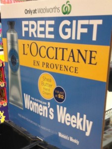 Woolworths stores have an excellent gift with which to promote the latest issue of The Australian Women’s Weekly – $12 worth of L’Occitaine Shea Butter. This is a perfect gift for the target AWW shopper.