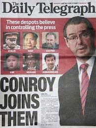 I am offended by the front page of The Daily Telegraph today. That they are using their newspaper to run a commercially interested political agenda with little regard for facts is bad enough but to suggest Stephen Conroy is the same as Robert Mugabe, Stalin and others is offensive. It is evidence of the lengths to which News will go to get its own way. News can’t be objective on this issue so they have tossed out even trying to look objective.