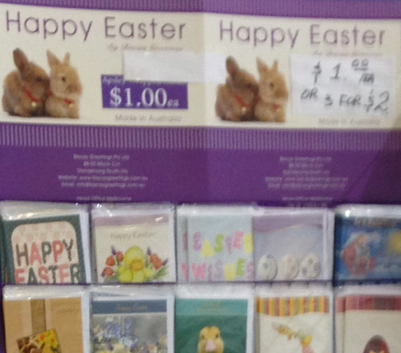 A deep discount shop near one of my newsagency appears to be having trouble selling their Easter cards. The have upped the ante from one dollar a card to now offering three for two dollars. In the meantime, our Easter card sales are on track to deliver 15% year on year growth off a good base from 2012.